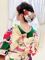 正面からもかすみ草が見えるようバランスよく配置。鮮やかなグリーンのお着物には紫や赤が使われているので髪飾りや小物にもポイントを押さえてアレンジしてあります。メイクはお顔立ちとお着物の雰囲気にあわせ肌感をいかすことに時間をかけました。