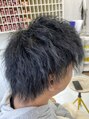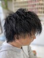 サイドはツーブロックにしてスッキリさせて緩めのツイスパをかけてカラーはブルーブラックで落ち着いた感じに仕上げました。