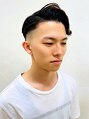 ハードパートにしたポンパドールのミドルフェードスタイルです。0mm~4mmで刈り上げています。前髪はしっかり立ち上げてポンパドールにします。前髪を膨らませて高い位置でふんわりと留めた額の出るヘアスタイルのことをポンパドールといいます。