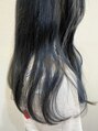 もともとブリーチが1.2回ほどあるベースを生かしなるべく深いブルーを入れました!室内ではブラックっぽくみえて光が当たると青の色がしっかりわかるカラーです(^^)