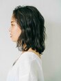ミディアムレングスのウェーブです。バングなしの髪型で暗めのトーンのスタイルなのでクールなイメージのスタイルになります。
