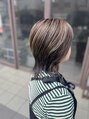表面に細かくハイライトを入れて、その上から全体のカラーを重ねてお染しています。暗めに染めて色持ちを良くさせたりハイライトの細さや量によって余り派手過ぎないようにもなる、前下がりのショートボブで乾かすだけで決まるスタイルです!