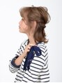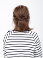 後頭部中央でひとつに結んで、細く毛束をつまみ出します。サイドから髪をひと束ねじりながら持ってきて、ざっくりほぐしたらピンで留めます。サイドから見たシルエットも可愛い、カジュアルアレンジ♪