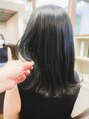 透明感は出ません!ブリーチオンカラーでロートーンなのに透明感のある仕上がり。青味に振り過ぎず鮮やかにしないことで奇抜ではないネービーカラーを実現。独自の理論に基づいた調合の賜物です。