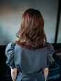 艶とリッジ感のでたウエーブで綺麗な髪へ。おすすめなミディアムスタイルです。 カール感よりウエーブのきいたパーマと艶が出るダークブラウンのカラーで大人の女性へ。前髪を作り抜け間を出すことで可愛らしさもあるスタイルです。