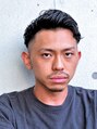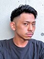 海が似合う男らしいアップバングスタイル。サイドは0.8mm~のツーブロックフェード。カーリーな質感が◎
