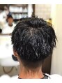 サイドを3mmのツーブロックを入れて後ろも刈り上げてスッキリさせたスマートマッシュに毛先まで強めにかけたツイストパーマで無造作な動きをプラス。