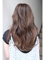 長めの前髪からつなげるレイヤースタイルで、動きを作りました。ひし形のシルエットがトレンド。Rケアカラーを使い、全体にメリハリの効いたバレイヤージュを入れベースを作り、パールベージュを重ねて仕上げました。