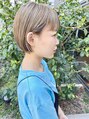 ブリーチ数回してる髪の毛に、柔らかいベージュで染めました♪長さは襟足ギリギリのぷつんとしたボブにしています◎