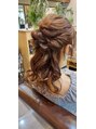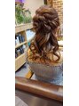 結婚式からパーティーまで幅広くいけるハーフアップスタイル。トップは波ウェーブからのクルリンパしてサイドはロープ編みで中央でとめてトップサイド共に毛束を少しづつ崩しながら引き出してルーズ感をだします。残しておいた髪を根元から巻いて完成。