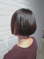 えりあしギリギリの前下がりボブスタイルです。耳後ろまでイヤリングカラーを入れました。平面的な仕上がりになりやすいボブスタイルも、インナーカラーで動きのある仕上がりになります。
