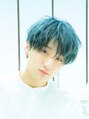 男性も韓国風ヘアーが大人気マッシュをベースにして束感がでるようにカット毛量調整前髪を下ろしながらセンターパートでコンマバングにセットサイドは6ミリ後ろは襟足ありブリーチ後にネイビーを入れたダブルカラー