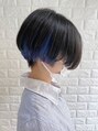 インナーカラー・イヤリングカラー・グラデーションカラーの要素を全部込めた、刈りあげショートボブ・ハンサムショート ブルー系のインナーカラーで、派手すぎないけどしっかり主張するカラーでキレイめおしゃれ♪