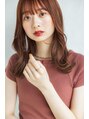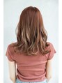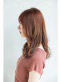 ぱっつんの前髪でモードさがありながら、パーマで動く髪の毛でナチュラルっぽさを残したヘアスタイル。ヘアカラーはオレンジベージュカラーでトレンド感と、オシャレ感のあるカラー。スタイリングはオイルでツヤを出す。