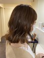 鎖骨ラインの外ハネにすることでボブでも軽やかな印象に。細かいハイライト(ベビーライト)を入れることによって透明感、立体感を出します。細かく入れてるので派手な印象にはならず、お勤めの方にもオススメです。