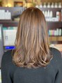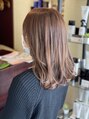 胸上のセミロングのローレイヤースタイルにルーセントセピアとルーセントロゼのミックスカラーを★表面に入れたハイライトが動きと立体感をプラス★