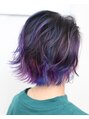 フルブリーチのベースに、根元はネイビー、毛先は塩基性のカラーを使って、ブルー、パープル、ピンクをランダムにオンカラー。デザインは気軽にご相談ください。