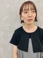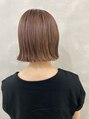 ピンクベージュの襟足ぱっつんボブ。前髪は束感をだして薄めにおろしたスタイルです。