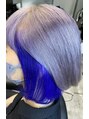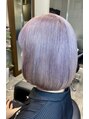 2、3ブリーチを全頭にかけてから、バング、インナーにディープパープルをオン、表面にペールライラックをオン。140℃低温アイロンでストレートにしてからバームで艶感を出します。