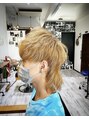 カットは襟足を残したくびれショート。表面にハイライトを入れて、立体感UP。白髪染めに感じさせない綺麗なバイオレットカラー。スタイリングは軽くアイロンいれて、Wax仕上げ。