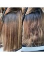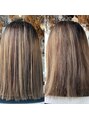 ハイライトが入っている状態でダメージ部分とクセの部分が複合している状態です。根本と毛先で薬剤を塗り分けての施術に酸性ストレートはブリーチしてる髪にも対応出来るのが強みです(^^)