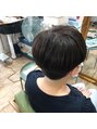 もみあげ4ミリツーブロック、耳上の長さにライン設定して、ワンレン。そのラインより下は全て刈り上げたショートスタイル。えりあしに生えぐせのある方もバッチリ。グレイカラーとファッションカラーのミックスで、カーキアッシュ。艶々ショート