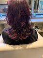 以前にインナーカラーをしてた裾の部分に全体に細くハイライトを入れてバイオレットのカラーバターでオンカラーしました。根本は白髪染めです。