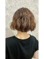 大人ボブパーマ、カラーのみでハイトーンベージュです。カットは顎下肩に当たらないくらいのボブ、毛量は適度にすいてます。パーマはコスメパーマでトップのボリューム、全体的にウェーブを出してます。