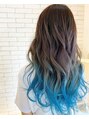 もともとグラデーションを何度かされてるお客様。毛先はベースのブリーチを生かし、中間の明るい所はトーンダウンしてグラデーションを作りました。オンカラーでブルーをのせています。※毛質によってはご案内お断りすることもあります
