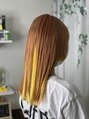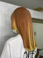 全頭ブリーチベースから作るピンクオレンジとイエローの組み合わせカラーです。顔周りは姫カットにモードなワイドバング。バングインナーもしています。ブリーチ履歴は5回以上ありますが、髪質によっては3回~が再現できるようになります。