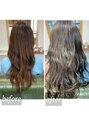 オレンジ味をしっかりと抑えて、カーキベージュに*ブリーチなしの透明感カラーです。髪の状態に合わせて薬剤をブレンド。実感は髪の骨格を補正し栄養チャージで質感と艶もきれいに。カットは整える程度でメンテナンスカットでした*