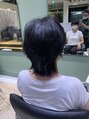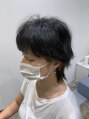 前髪と耳上にインナーカラーをいれたかなりボーイッシュな感じのウルフスタイル!インナー部分以外はブルーブラックで暗めにしてますが、重くなり過ぎないよう毛量調整しています。最近耳にかけるスタイルが多いので、スッキリさせたい方におすすめです。