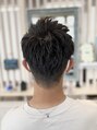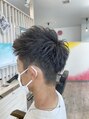 メンズショートパーマスタイル。毛先に柔らかな動きをピンでつけることで、セットがやりやすく、かつ軽やかな動きを演出。爽やかさ、ワイルドさ、どちらも演出できるメンズパーマスタイル