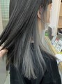 前髪とサイドから襟足にかけてシアーグレーのインナーカラーを入れたスタイル。明るめのグレーはブリーチ2回以上必要です!表面は赤みのないアッシュで染めてコントラストを出すと◎
