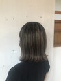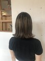 カットは鎖骨位の長さで切りっぱなしボブに。アウトラインを残して毛量調整してあります。カラーは、ブリーチでハイライト、ローライトも混ぜて全体に入れました。オリーブ系で上から重ねてあります。