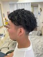 硬め直毛の髪質でもパーマで柔らかく動きのあるスタイルに襟足は短めに刈り上げて3ミリでツーブロックにすることで多毛のお客様もさっぱり営業マンスタイル