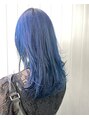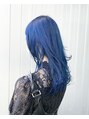 ブリーチ1回のブルーネイビーカラー^^ パープルを混ぜることで退色しても黄色味の少ない綺麗なベージュになります。彩度の濃いカラーは生え際を少し濃いめに入れて肌馴染みをなるべく良くしてあげるのもポイントです。