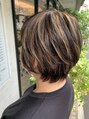 ベースは暗めのブラウン、ハイライトを全体に入れアクセント多めのショートスタイル*デザインハイライト/大人ショート/丸みショート/40代50代60代/本郷三丁目/白髪染め/ヘッドスパ/髪質改善/縮毛矯正