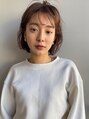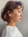 切りっぱなし風にカットして、表面にうっすらレイヤーを、いれています。前髪は眉下でカット!カラーは、ブラウンをベースに耳周りはインナーでラベンダーピンクを入れてセンスの光る大人ミディに!