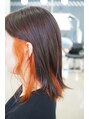 インナーにオレンジカラーで普段のヘアスタイルにアクセントを。ベースカラーは暗めにする事でインナーをより際立たせるスタイルです。いつもの自分から少し変化が欲しい方にオススメです。