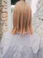ハイトーン切りっぱなしボブスタイル!明るめの髪色と毛先のすき具合で重くなりすぎないボブです。顔周りの毛を短くすることで定番になりすぎなく、個性的な印象になります。ハイトーンで洋風ブロンドカラーです!