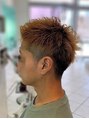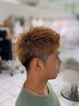 周りはスッキリと刈り上げて、前髪を立たせて爽やかにしました!カラーはわざと根元を染めず、黒いことによりスタイリングをするとより動きが出るようにしています。
