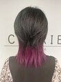 ウルフカットスタイルのインナーカラーデザインです。トップは地毛を活かしたブラック、インナーはブリーチ後にカラートリートメントのバイオレットを使用。お客様の癖を活かして後頭部にボリュームを出しました。