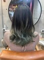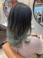パキッと境目がならないようなテクニックで毛先だけブリーチ。抜いた部分は暗髪と馴染みの良い寒色のブルーグリーンを淡めにオン。初めてのブリーチや肌が弱い人でも地肌にカラーが付かないのでオススメ♪
