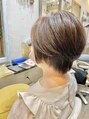 前下がりのショートボブ。少しくびれさせて頭の形が良く見えるように見せています。ハンドブローで仕上がるように削ぎすぎないようにしています。