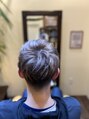 プラチナシルバーのハイライトでランダムかつムラ染風カラーが主役のデザイン。ブリーチなしのハイトーンカラーで髪や地肌にやさしいデザインカラーです。
