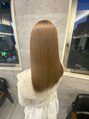 暗髪の施術履歴によつて赤みの残留が酷く、縮毛矯正もしていたので、ダメージがより出てしまう強いブリーチが使えない状態でした。少しでもダメージを抑えるためにケアブリーチを使用して赤みがあってもできる透明感のあるブラウンベージュにしました!