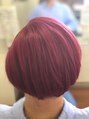 ブリーチ1回してヴィヴィとなピンクをかけましたサイドは2グロックで片方は高く刈り込み個性的なスタイルです