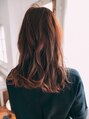 全体をゆるくウェーブにして、顔まわり、表面の毛束をミックスで巻いたセミロングスタイルです。 バングを薄く短めにすることで、軽さとエアリー感をプラスしています。 色は根元を少し暗めにして、グラデーションにすることで立体感をだしています。