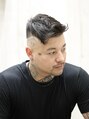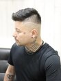 かきあげた前髪はセクシーにサイドへ垂れ落とし、フェイド部分には遊びのデザインを入れたやんちゃなスタイルです。